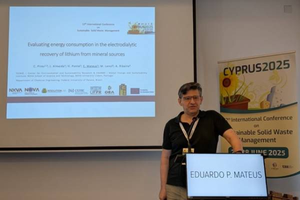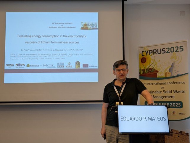 From June 25 to 28, 2025, Eduardo Mateus and Alexandra Ribeiro from NOVA University Lisbon went to Paphos, Cyprus, to participate in the 12th International Conference on Sustainable Solid Waste Management (CYPRUS2025). Eduardo Mateus had the opportunity present the work titled “Evaluating Energy Consumption in the Electrodialytic Recovery of Lithium from Mineral Sources”, authored by Carolina Pires, Joana Almeida, Haroldo Ponte, Eduardo P. Mateus, M. K. Lenzi and Alexandra B. Ribeiro.